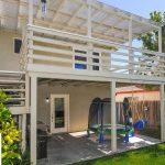 The private backyard features a multi-level deck, storage shed, and fruit trees.