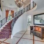 The dramatic two-story grand foyer opens to a grand staircase with wrought-iron railing. Downstairs, a private study with built-in shelving and a closet can also serve as a guest bedroom. Two sets of French doors connect the kitchen, living and dining areas to the backyard.