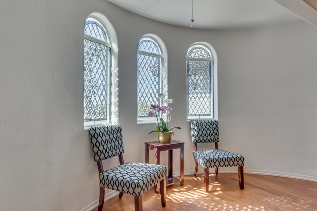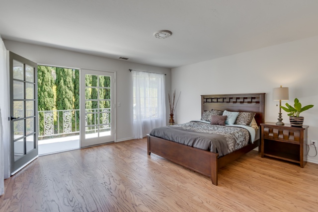 The Master Retreat features a double-sided fireplace and private balcony, which overlooks the backyard. The master bath is newly renovated, with a custom tile shower and double sinks. Relax in a claw-footed soaking tub beneath a chandelier, and enjoy a panoramic mountain and peek ocean view.
