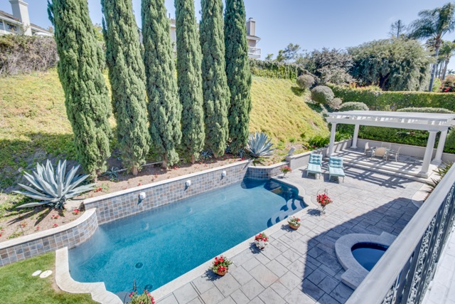 The private backyard is complete with a custom pool and spa, newly-installed landscaping, and a pergola large enough to host a small wedding. For your convenience, there is a full bath with direct access to the pool.