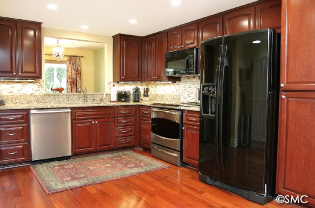 A private courtyard entrance leads you to the bright open floorplan. Downstairs, the home has been updated with high-end Lauzon mahogany floors, recessed lighting, and an upgraded kitchen that has under-counter lighting, granite countertops, glass tile backsplash, and refinished cabinets. Three large white pantries are also included in the sale. High-end stainless steel appliances include a Miele dishwasher and a GE Profile Series Induction Range. The black Whirlpool side-by-side refrigerator also comes with the home.