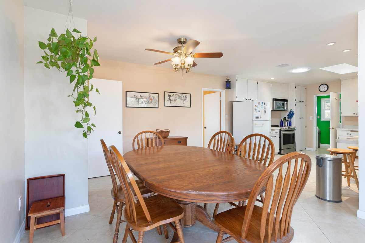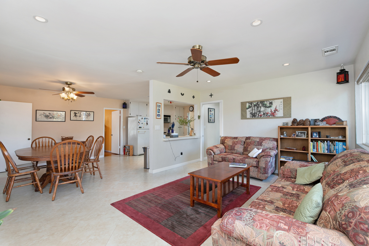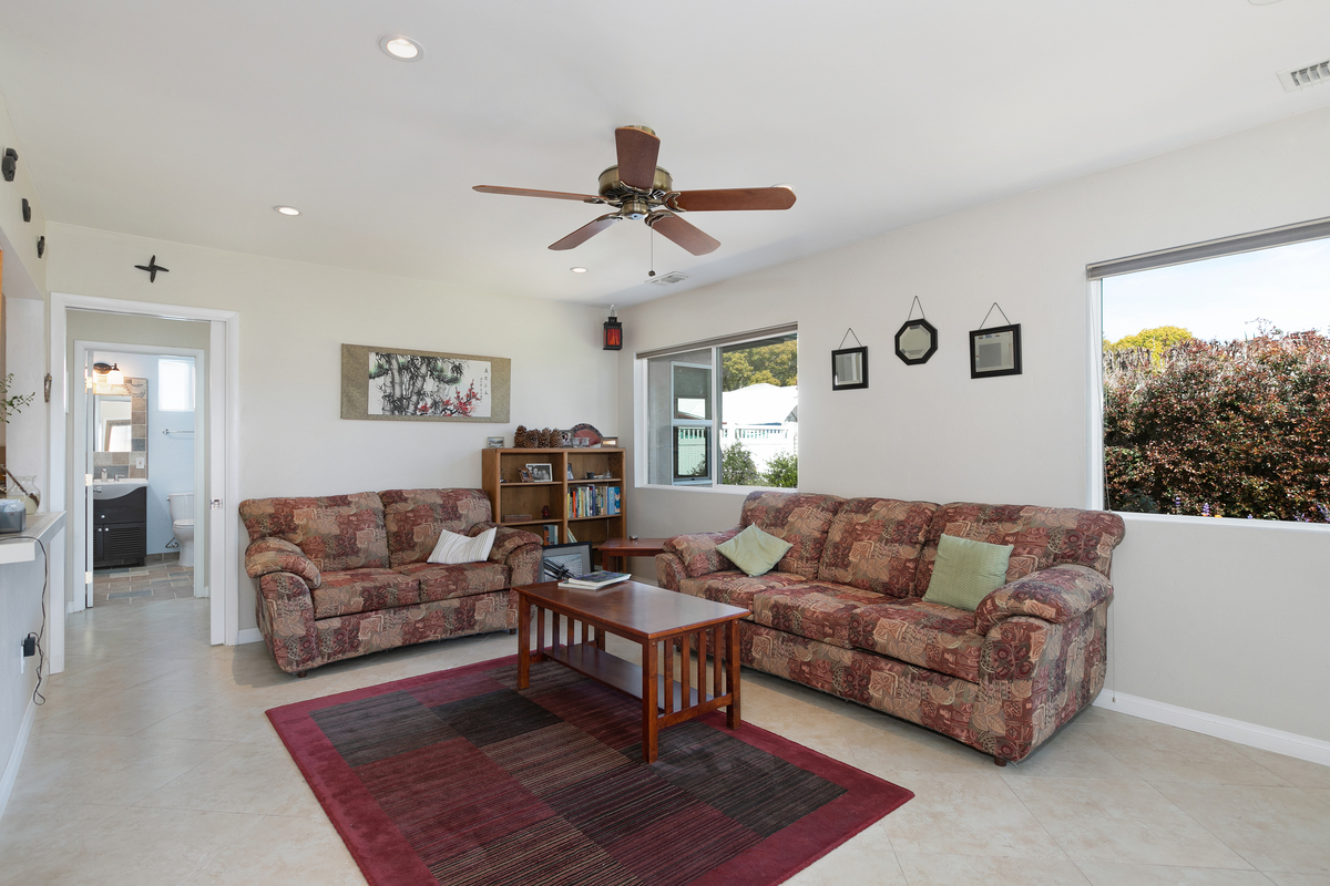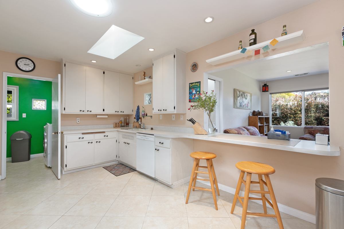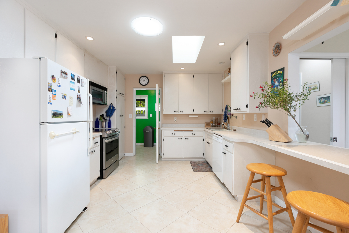 This mid century single story home features original oak floors, tile floors, and newer dual-pane windows. The main bedroom suite and expanded 18’ x 13’ family room, added in 2006 with permits, both offer tranquil views of the backyard. Both bathrooms feature custom tilework.
