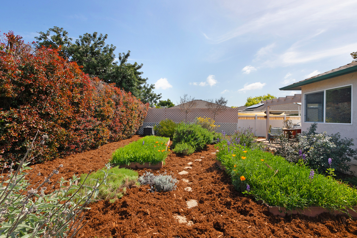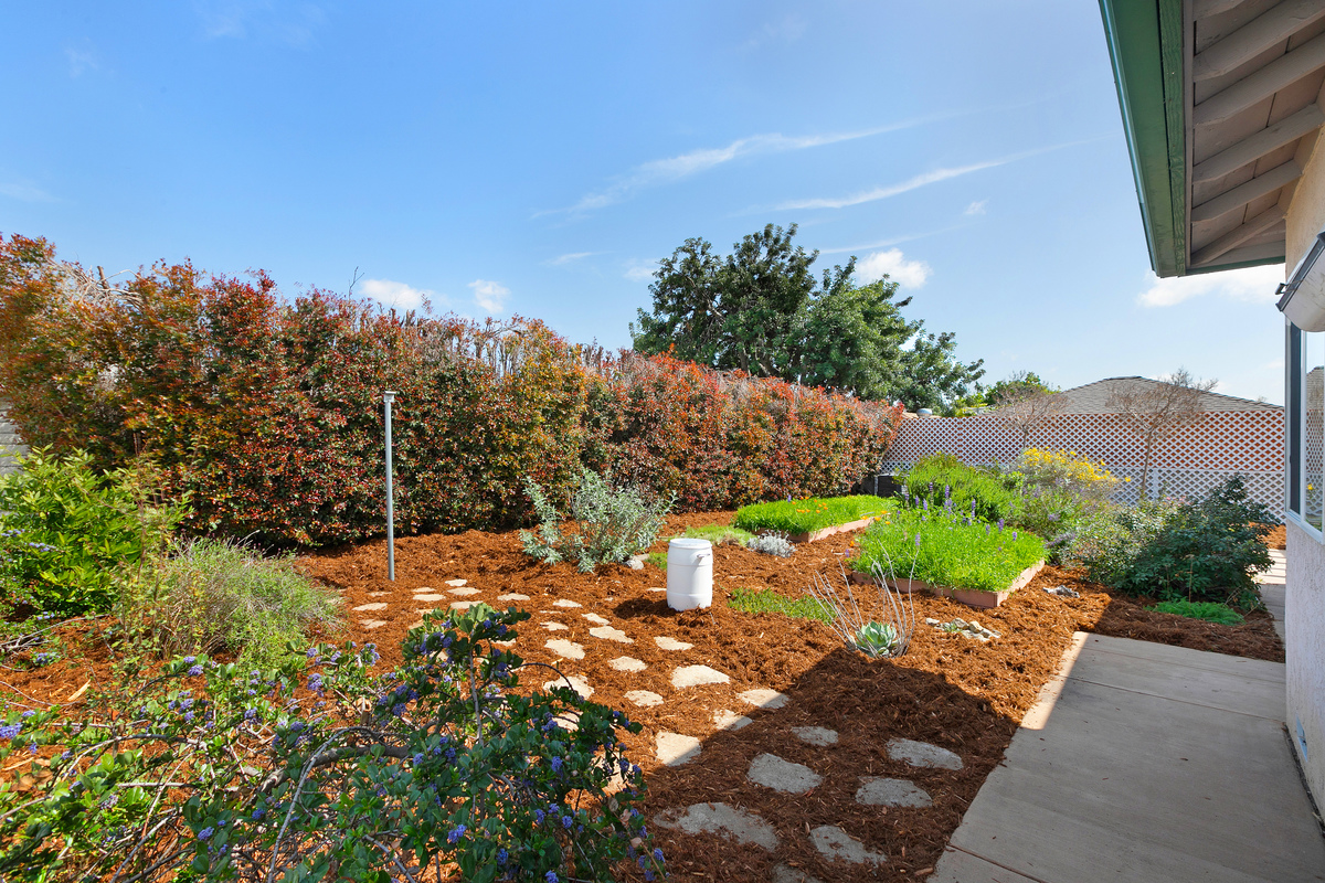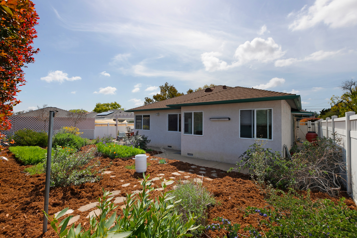 Both front and back yards feature water-wise California native landscaping, which provides habitat for songbirds, butterflies, and pollinators. Meandering walkways and raised garden beds invite children and adults alike to explore the different areas of the garden. Both front and back yards are drip-irrigated, with 5 rainwater catchment barrels providing supplemental irrigation.