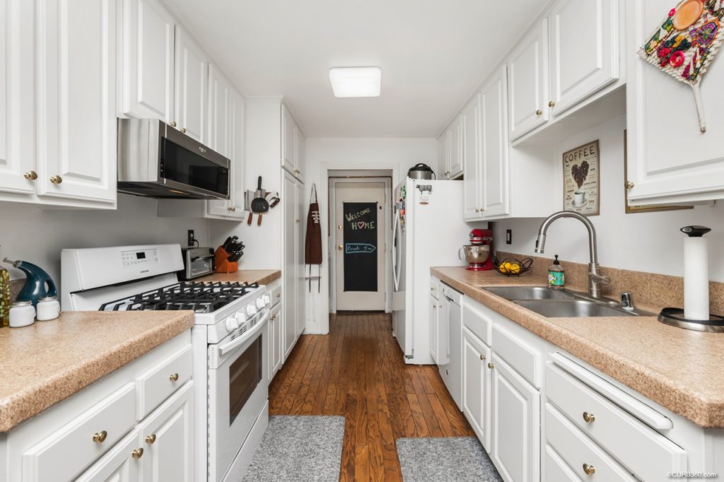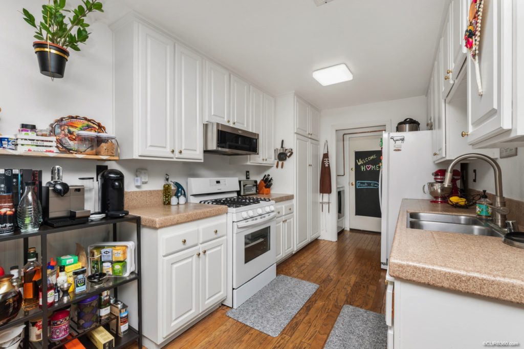 The condo has been updated with recessed lighting and modern light fixtures. The lighting is wi-fi controlled. The kitchen/dining area has original hardwood floors and wainscoting.