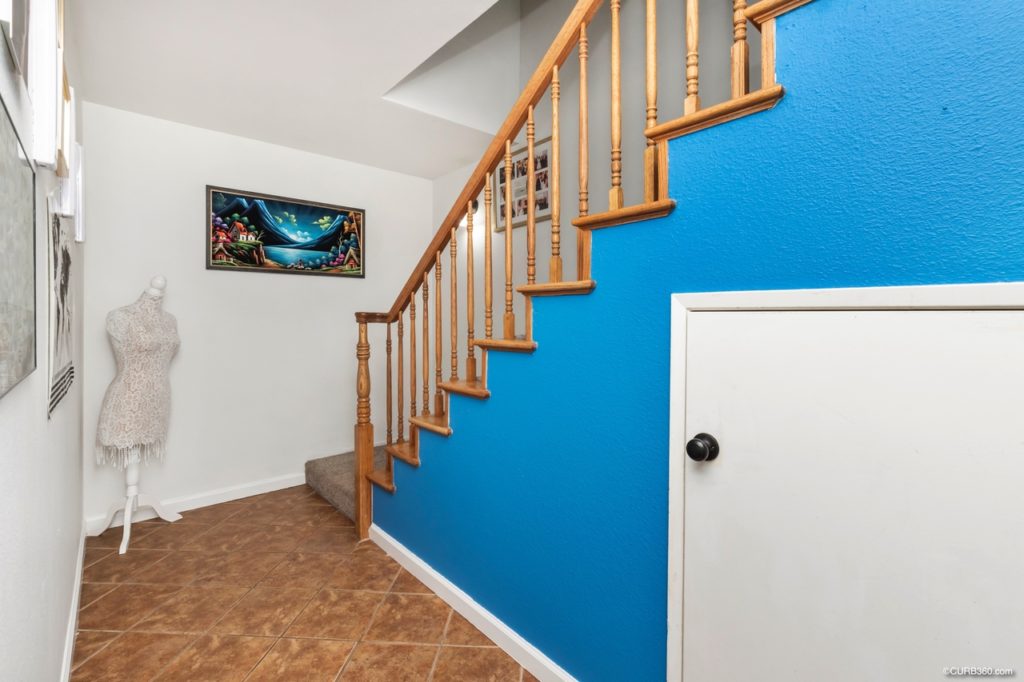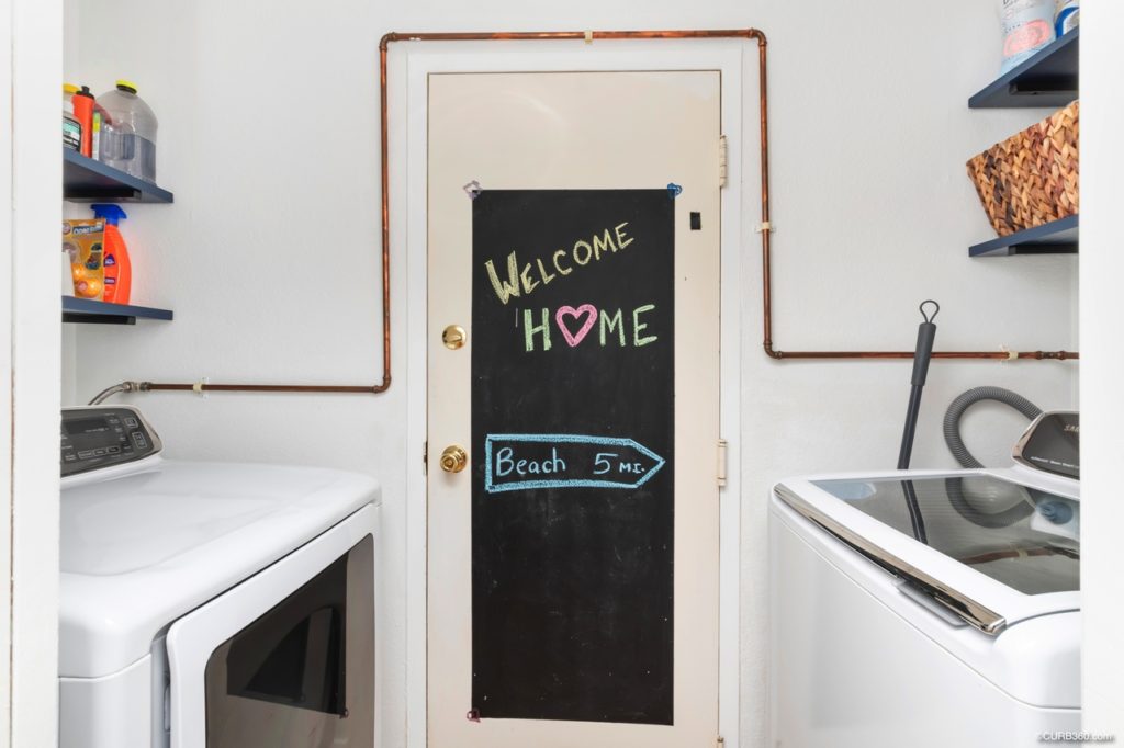 On the entry level, the kitchen opens to an open living and dining area. The kitchen features newer appliances, gas cooking, and recently refaced cabinets. There is also an attached laundry nook, with full-size Samsung washer and dryer, and shelving for storage. You don’t need to buy any appliances to move in: the washer, dryer, and refrigerator are included in the sale of the home.